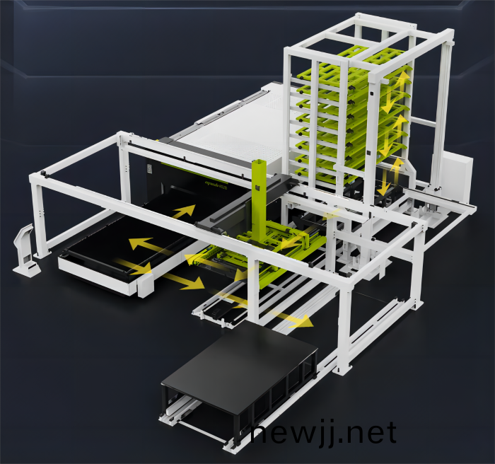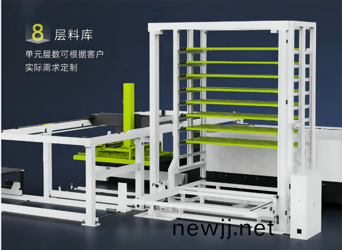 該係統實現了材料齣庫、自動上料、激光切割、自動下料、入庫倉儲等一係列(lie)生産(chan)流程的自動化、不間斷完成,